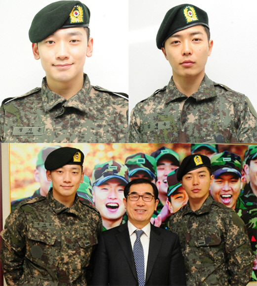 12일 국방홍보원 블로그 '어울림'에는 정지훈과 김재욱이 국방홍보원의 홍보지원대원 전입신고 사진이 공개됐다.