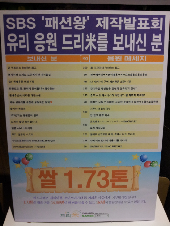 유리는 14일 서울 김포공항 롯데시네마에서 진행된 SBS 드라마 '패션왕' 제작발표회에 참석했다. 그의 첫 연기도전을 축하하기 위해 DC인사이드 유리 갤러리, 팬카페 화수은화, 125번지, 일본 팬카페 mixi 소녀시대, 중국 팬카페 플라이 유리 중문점과 유리 티에바, 태국 팬사이트 캡율닷컴 등의 팬들은 1.73톤의 쌀화환을 보내왔다. 쌀 1.73톤은 결식아동 1만 4000명이 한 끼를 먹을 수 있는 양이다.