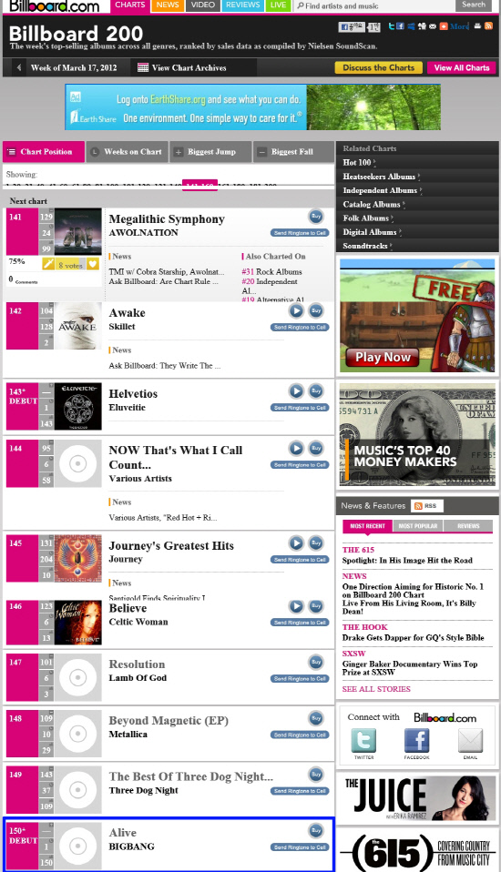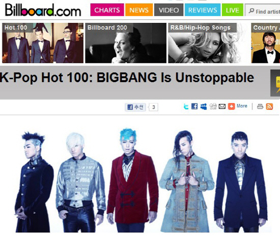 빅뱅은 최근 미니앨범 5집 '얼라이브'로 빌보드 메인 차트인 '빌보드 200'에서 150위를 차지했다. 한국 가수가 한국어 앨범으로 빌보드 메인 차트 진입에 성공한 것은 빅뱅이 처음이다. 이어 13일에는 "빅뱅의 인기를 멈출 수 없다. '빅뱅 돌풍'이 향후 K-POP 차트에 큰 변화를 일으킬 것"이라는 극찬을 받으며 미국 빌보드 메인화면을 장식, 화제를 모았다. 아시아 가수가 단 한 번의 현지 프로모션 없이 이와 같은 성적을 낸 것은 빅뱅이 최초다.