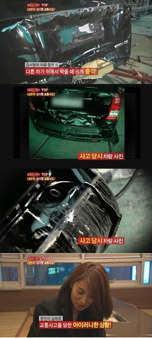 방송에 공개된 김서형의 교통사고 차량은 뒷문이 안 열릴 정도로 처참하게 파손된 상태였다. 사고 차량 정비사는 "안에 타고 있던 사람이 상당히 충격이 컸을 것이다. 운전기사님은 사고 후에 왔는데 잘 못 걸으셨다. 힘들어해서 바로 병원으로 갔다"고 당시 상황을 전했다.