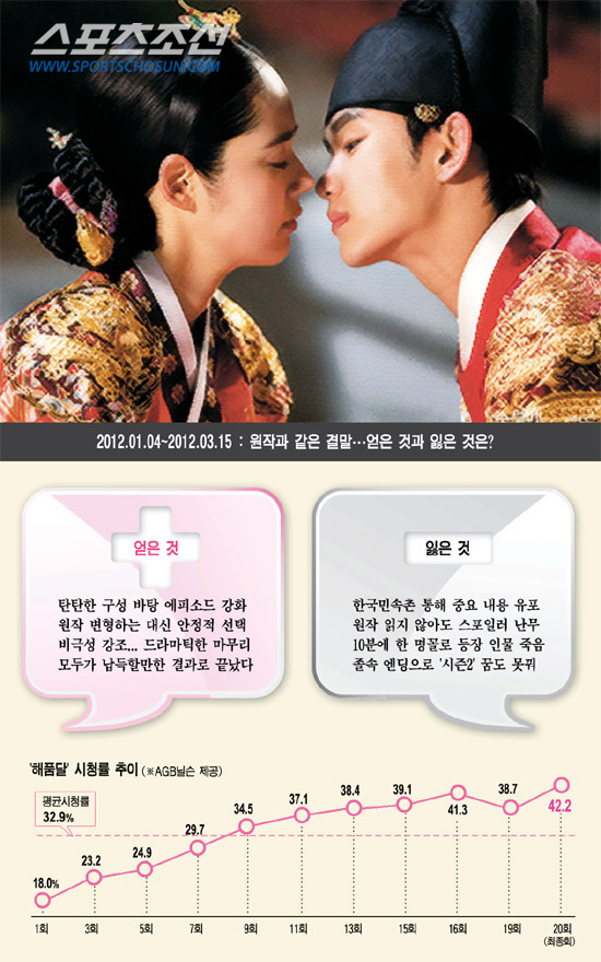 사실 종영을 앞두고 결말은 어느 정도 공개돼 있었다. 원작소설 자체가 스포일러이기 때문이다. 시작부터 예고된 결말을 향해 달려온 셈이다. 제작사 팬엔터테인먼트 관계자는 "진수완 작가가 고민을 많이 했지만, 드라마의 기획 단계부터 원작의 결말을 따라가기로 결정한 상태였다"고 말했다. 원작을 변형하는 실험을 택한 대신 캐릭터의 비극성을 구현하는 안정적인 전략을 택한 것이다. 이 관계자는 "원작의 캐릭터를 따라가되 살을 붙이고, 극의 에피소드와 대사를 강화하고자 했다. 원작을 가진 작품은 그 원작과의 비교를 피할 수 없다. 때문에 소설과는 다른 드라마다운 엔딩을 맺고자 특별히 신경을 썼다"고 설명했다. 이 설명처럼 '해품달'의 드라마틱한 엔딩은 원작의 탄탄한 구성에 기댄 측면이 크다. 덕분에 드라마의 완성도를 높일 수 있었고 모두가 납득하는 드라마다운 결말을 맺은 점은 장점으로 꼽힌다.