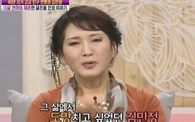 김민정은 21일 방송된 KBS '여유만만'에 출연해 "초혼 시절 한남동 240평 집에 살았다. 그 대궐 같은 집은 창살 없는 감옥이었다. 경제력보다 마음이 따뜻한 사람을 원했다. 그 삶에서 도망가고 싶었다"고 이혼 배경을 설명했다. 이어 두번째 결혼에 대해서는 "힘든 상황에서 만났다. 정말 따뜻한 사람이었다. 재혼 당시 집안의 반대에 부딪혔다. 가족들과 친구들 모두 남편이 어린데다 내가 또 상처를 받을까봐 심하게 말렸다. 자녀들은 어렸기 때문에 큰 반대는 없었지만 상처는 있었을 것이라 생각한다. 아이들이 좀 컸을 때 새 아버지를 탐탁해하지 않았던 적이 있었다. 그때 진솔하게 설득했다. 나중에 나이 들어서 짐이 되고 싶지 않은 엄마의 마음을 이해해준 것 같다"고 말했다.