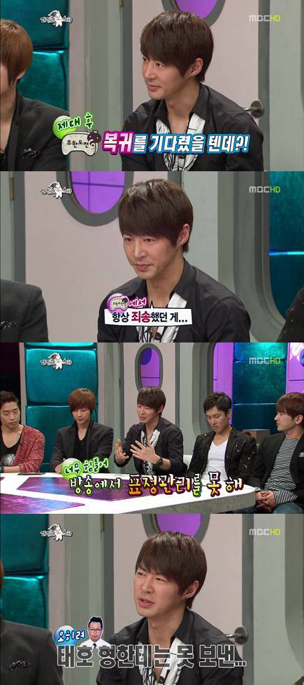 MC 김구라가 "김태호 PD는 문자로 관리(?)하냐"고 묻자 전진은 "전 억지로 사람을 관리 못하는 편"이라고 웃으며 "다른 멤버에게는 연락하지면 (김)태호 형님에게는 너무 죄송해서 연락을 못했다"고 솔직히 털어놓았다. <스포츠조선닷컴>