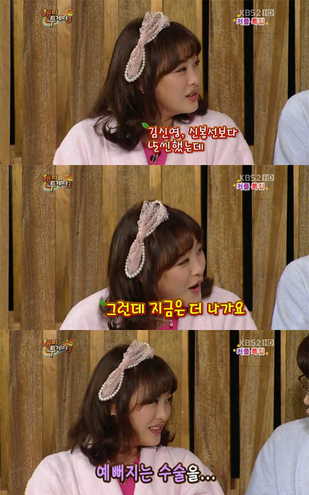 또한 심진화는 물오른 미모에 대해 "원래 내가 이목구비는 참 예쁘다. 근데 얼굴이 워낙 동그랗다보니 보정을 했다. 좀 쳐냈다"며 턱을 깎는 시늉을 했다. 이를 들은 다른 출연진들이 놀라워하자 그는 "(수술)한 게 이거다"라며 너스레를 떨어 폭소케했다.
