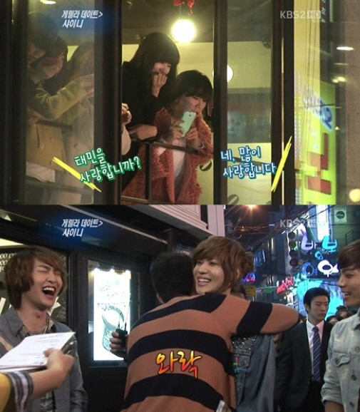 3월 31일 방송된 KBS2 '연예가 중계'에서는 샤이니의 게릴라 데이트가 전파를 탔다. 이날 리포터는 샤이니와 여성 팬들의 게임을 진행하던 중 "샤이니 남성팬도 있습니까"라고 외쳤다. 이에 많은 남성 팬들이 손을 들었고, 이중 한 남성팬은 "태민의 팬"이라고 밝혀 눈길을 끌었다. 이 남성팬은 "태민씨를 사랑합니까, 포옹할 수 있겠습니까"라는 리포터에 질문에 태민을 끌어안았다. 기습 포옹을 당한 태민은 어색한 미소를 지어 주변을 폭소케 했다.