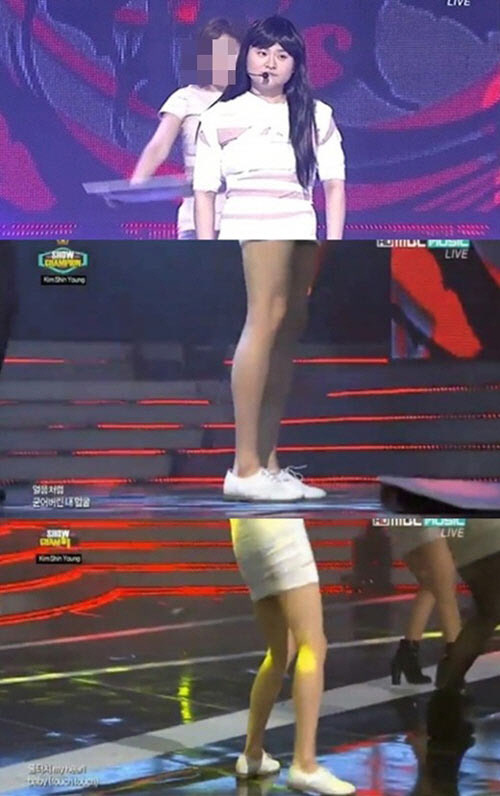 이날 미쓰에이 멤버 중 수지를 따라한 김신영은 긴 생머리와 붕대 의상으로 날씬한 몸매를 드러냈다. 최근 5개월 만에 15kg을 감량해 화제가 됐던 김신영은 굽이 없는 운동화를 신었음에도 군살 없이 쭉 뻗은 매끈한 각선미를 과시해 보는 이들의 놀라움을 자아내고 있다.