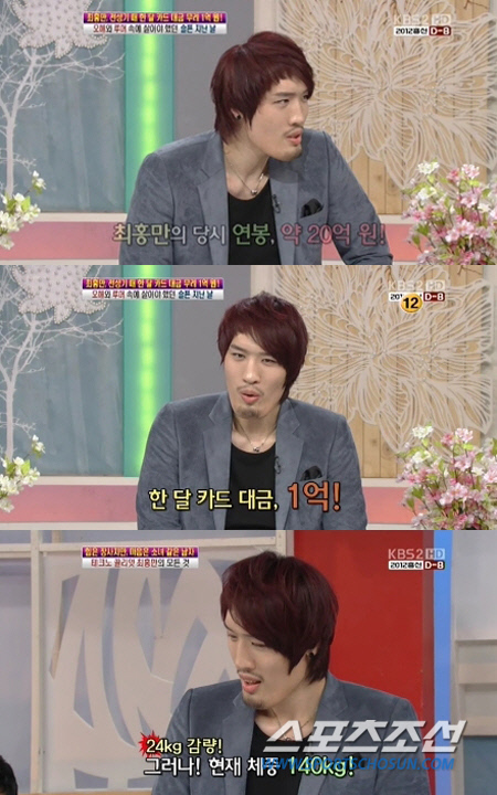 또한 이날 방송에서 최홍만은 씨름선수에서 이종격투기 선수로 전향한 후 수입을 공개해 눈길을 끌었다.