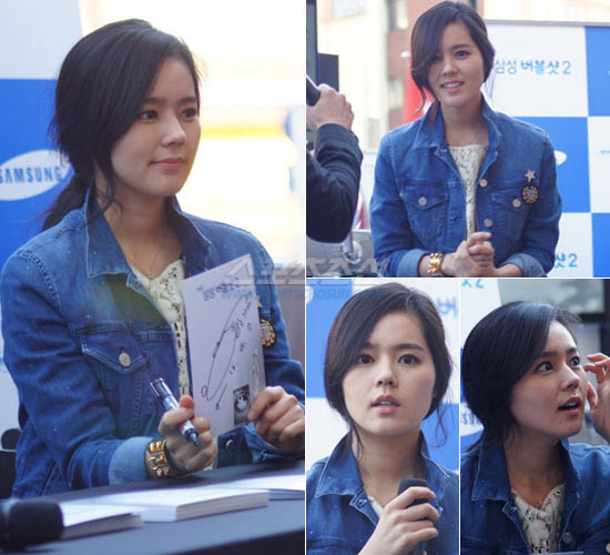 살짝 웨이브진 머리를 자연스럽게 묶고 청재킷에 흰 블라우스를 매치한 한가인은 자신을 보기위해 참석한 팬들을 향해 환한 미소를 짓고 있다.