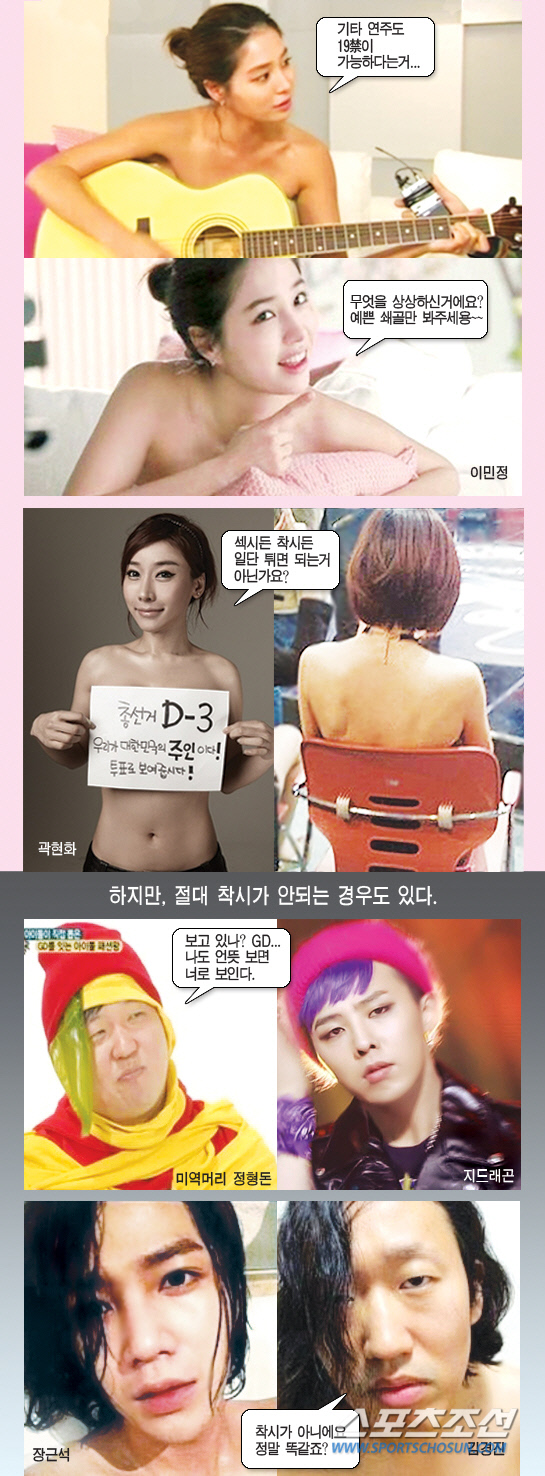 요즘 착시효과를 일으키는 사진으로 새삼 주목을 받고 있는 스타들이 있다. 인터넷에 공개된 이민정의 '착시효과 시리즈'는 소품으로 절묘하게 가려진 몸에 아무것도 걸치지 않은 것처럼 보여 화제가 되었다. 이에 질세라 개그우먼 곽현화는 착시사진을 투표홍보에 이용하는 재치를 발휘했다. 야릇한 상상과 소소한 웃음을 주는 연예인들의 착시사진을 감상해 보자.