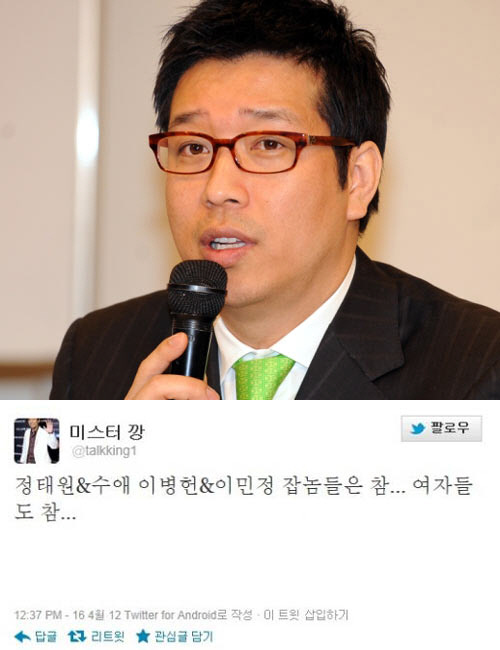 강병규는 16일 오후 자신의 트위터를 통해 "정태원&수애, 이병헌&이민정 잡놈들은 참... 여자들도 참..."이라는 글을 게재했다.
