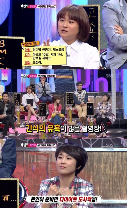 지난 17일 방송된 SBS 예능프로그램 '강심장'에 출연한 김신영은 간식의 유혹이 많은 촬영장과 회식자리에서까지 철저하게 다이어트 식단을 지켜 16kg을 감량한 사실을 밝혀 모두를 깜짝 놀라게 했다.