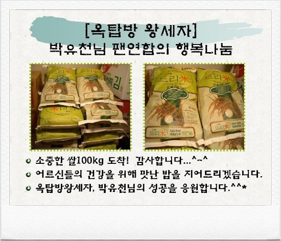 인터넷 게시판에는 "멀게만 느껴졌던 박유천씨가 조금은 가깝게 느껴졌다" "역시 멋진 스타 곁엔 멋진 팬이 있군요" "쌀이 떨어져 걱정이 많았는데 유천님과 팬클럽 여러분들 덕분에 어르신들께 식사를 대접할 수 있었습니다" 등 훈훈한 후기가 이어지고 있다.