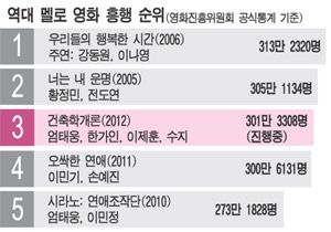 그동안 멜로 영화는 극장가 흥행에서 큰 재미를 보지 못했다. 2005년 개봉한 '너는 내 운명'(305만 1134명, 영화진흥위원회 공식통계기준)과 2006년 개봉한 '우리들의 행복한 시간'(313만 2320명) 정도만 눈에 띈다. 로맨틱 코미디에 공포를 더한 '오싹한 연애'(300만 6131명)가 있었지만, 정통 멜로는 아니었다.