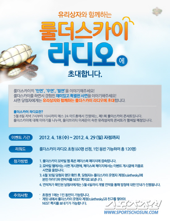 특히 이번 유저간담회는 실제 '룰더스카이'를 즐기고 있는 유리상자의 이세준도 참석해, 감미로운 무대를 선사한다. '룰더스카이 라디오'는 게임과 관련된 사연을 가진 60명(1인 동반 가능)을 선정해 초대로 진행되며, 참여를 원하는 분은 오는 29일 자정까지 '룰더스카이' 모바일 공식 홈페이지 게시판 (www.rulethesky.co.kr)이나 룰더스카이 페이스북 페이지(www.facebook.com/rulethesky)에 사연을 올리면 된다. 남정석 기자 bluesky@sportschosun.com