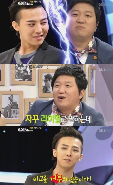 20일 방송된 SBS '고쇼'에 출연한 지드래곤은 자기 소개를 하던 도중 저작권료와 패션 등 자신의 장점을 나열했다. 그는 정형돈이 자신의 패션에 대한 자신감을 드러내며 "지드래곤 보고있나"라고 말한 것을 언급하며 "옷을 벗을 수 없어 입었을 뿐인데 패션아이콘이라 부르더라. 정형돈이 내게 '보고있나'라고 하는데 오늘 이후로 비교를 거부하겠다"고 밝혔다. 이에 정형돈은 지드래곤의 올블랙 패션을 지적하며 "우엉같다"고 놀렸다. 또 지드래곤과 함께 즉석 패션 대결을 펼쳐 눈길을 끌었다.