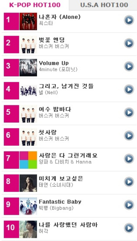 19일 씨스타의 소속사 스타쉽엔터테인먼트에 따르면 씨스타는 미국 빌보드 4월 3주차 'K팝 핫 100' 차트에서 1위에 올랐다. 이는 버스커 버스커의 독주를 막아내며 다시 한번 씨스타의 위력을 입증한 셈이다.