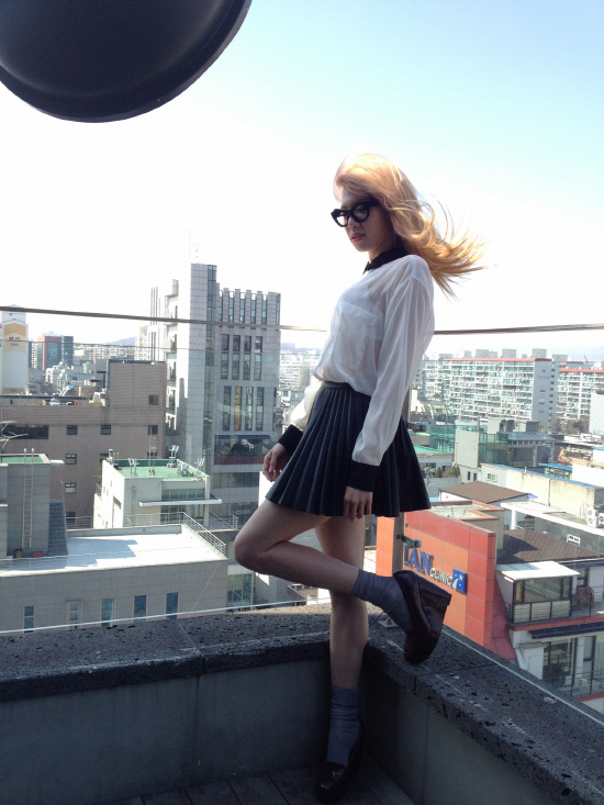 사진 속 미(MIIII)는 빌딩 옥상에서 금발의 긴 머리를 휘날리며 '학다리' 포즈를 취하고 있으며, 흰 블라우스에 검정 주름치마를 매치해 세련되고 시크한 매력을 선보였다.