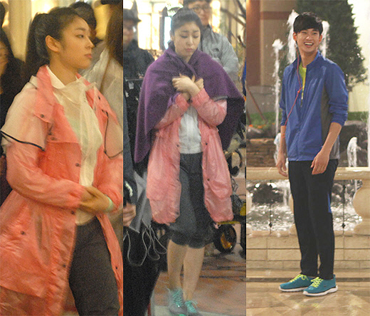 촬영 당시 비가 내린 듯 김연아는 쉬는 시간에는 핑크색 우비와 담요를 덮으며 추위를 피하고 있는 모습. 또 테라스에 앉아 있는 김연아를 향해 환하게 웃으며 다가오는 김수현의 모습도 눈길을 끈다.