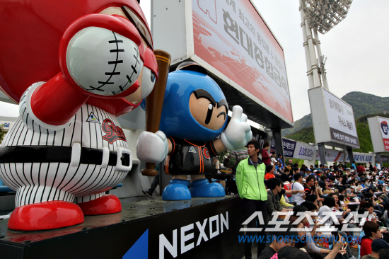 29일 부산 사직구장 내 설치된 2.5m 크기의 조형물은 넥슨의 대표 캐릭터인 '다오'와 '배찌'로, 외야석 전광판 옆에 설치돼 구장 어디서나 그 모습을 확인할 수 있어 사직구장을 찾은 관람객들에게 또 하나의 볼거리가 될 것으로 예상된다. 공식 후원기업의 조형물이 야구장 내에 설치된 것은 국내 프로야구 사상 처음이다.