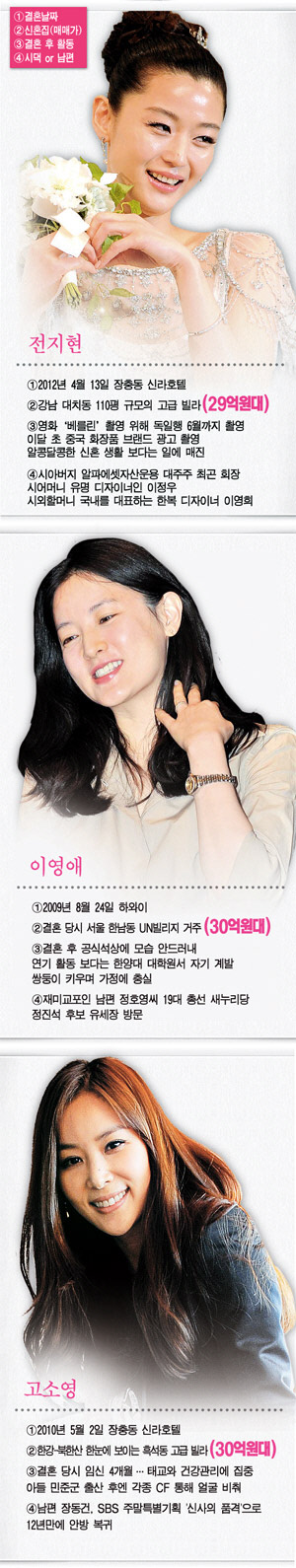 전지현(31), 이영애(41), 고소영(40). 국내를 대표하는 톱여배우들이다. 이들의 공통점이 있다면 이미 '품절녀'가 됐다는 것. 이영애는 지난 2009년 미국 하와이에서 재미교포 사업가 정호영씨와 백년가약을 맺었고, 고소영은 2010년 배우 장동건과 '세기의 결혼식'을 올렸다. 셋 중 막내 전지현은 지난달 동갑내기 금융계 종사자 최준혁씨와 웨딩마치를 울렸다. 여기서 궁금해지는 것이 있다. 톱여배우들의 신혼 생활은 일반인들과 뭔가 달라도 다르지 않을까? 전지현, 이영애, 고소영의 신혼생활을 살펴봤다.