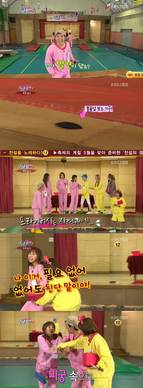 지난 5일 오후 방송된 KBS2 '청춘불패2'에서는 어린이날을 맞아 소녀시대의 태연과 브아걸의 나르샤를 게스트로 초대해 '청불 운동회'를 개최했다.