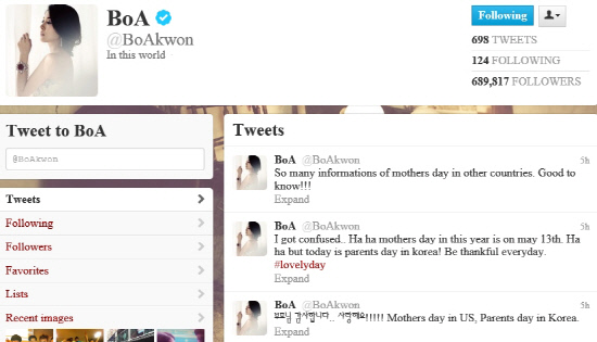 어버이의 은혜에 감사하고 어른과 노인을 공경하는 경로효친의 전통적 미덕을 기리는 날이 바로 어버이날이다. 카네이션이나 작은 선물로 감사의 뜻을 전하는 이 날, 스타들도 트위터를 통해 부모님에 대한 사랑을 드러내 눈길을 끌었다.