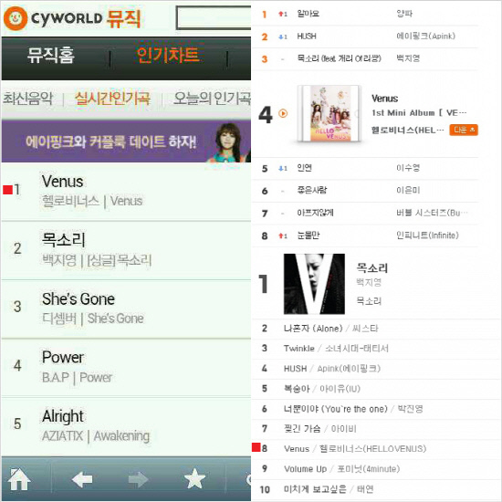 9일 발표된 헬로비너스의 데뷔앨범 타이틀곡 '비너스'는 싸이월드 실시간 차트 1위를 차지하는 기염을 토했다. 이밖에 벅스(4위) Mnet(8위) 등에서도 실시간 차트 상위권을 휩쓸며 대형신인 탄생을 예고했다.