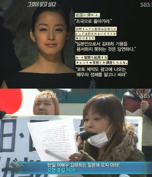 이는 지난 3월 국내 방송 SBS '그것이 알고싶다'에서도 '누가 김태희를 쫓아냈는가?'라는 주제로 일본에서 벌어지고 있는 김태희 퇴출 시위 관련 혐한류의 실태가 보도되기도 했다.