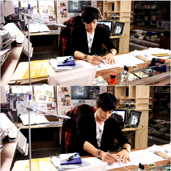 장동건은 오는 26일 방송될 '신사의 품격'에서 건축사 설계도면을 작업하기 위해 집중하고 있는 모습을 통해, 일에 관해서는 철저하게 프로페셔널한 건축사 김도진의 카리스마를 고스란히 담아냈다.