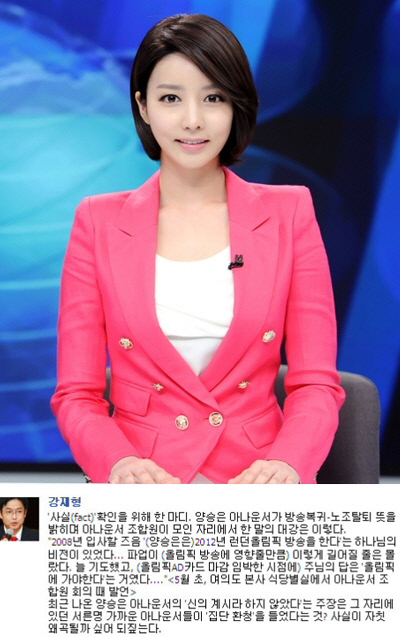 "'2008년 입사할 즈음 (양승은은) 2012년 런던올림픽 방송을 한다'는 하나님의 비전이 있었다. 파업이 (올림픽 방송에 영향을 줄만큼)이렇게 길어질 줄은 몰랐다. 늘 기도했고, (올림픽 AD카드 마감 임박한 시점에) 주님의 답은 '올림픽에 가야한다'는 거였다"