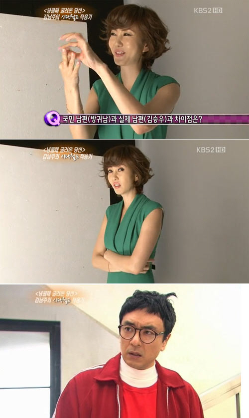하지만 김남주는 "김승우가 스킨십을 할 때 좀 다르다"며 "귀남이는 드라마에서 윤희하고 손도 잘 잡고 다니는데 남편은 사람들이 있을 때 손을 잡거나 하면 제 손가락을 하나씩 펼쳐서 쑥 밀어낸다. 너무 하는 거 아니냐"고 불만어린 표정을 지어 웃음을 자아냈다.
