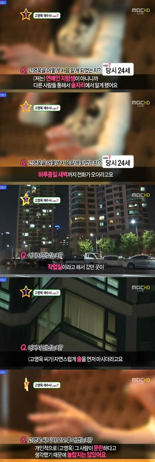 이 여성은 고영욱과 만났을 당시 24살이었다고 밝히며 "저는 연예인 지망생이 아니었으니까 다른 사람들 통해서 술자리에서 (고영욱을) 알게 됐다"고 털어놨다.