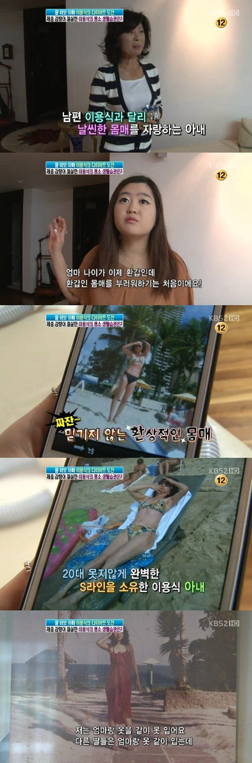 이어 이 씨는 핸드폰 속 비키니 입은 어머니의 사진을 공개했다. 사진 속 이용식 아내는 군살 없는 완벽한 S라인으로 환갑의 나이를 가늠할 수 없는 환상적인 몸매를 지니고 있었다.