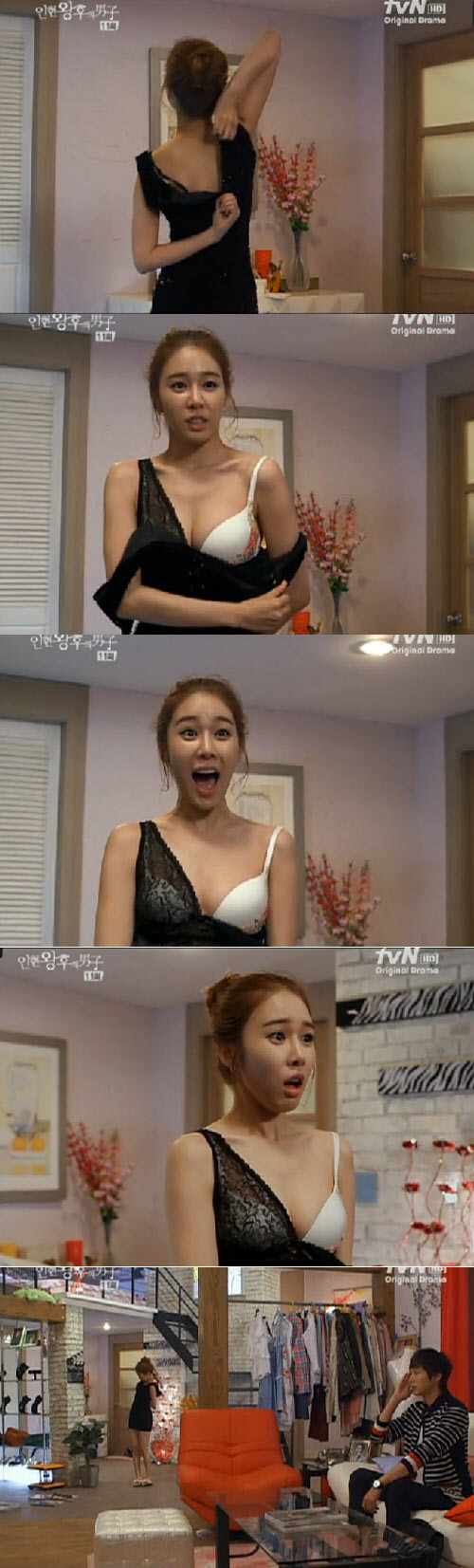 바로 이 장면에서 유인나는 벗겨진 블랙 미니 원피스 윗부분 사이로 어깨라인과 등 부분, 하얀색 속옷을 적나라하게 노출해 시청자들의 눈길을 끌었다. 유인나는 과감하게 속옷을 노출하며 볼륨감 넘치는 글래머러스한 몸매를 과시해 남성 팬들의 시선을 모았다.