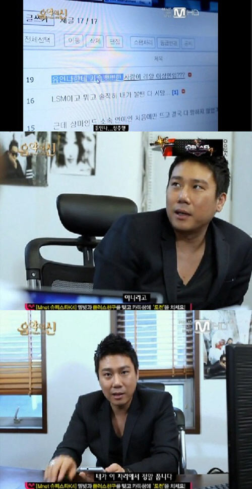 이상민은 지난 23일 방송된 Mnet '음악의 신'에서 세간에 떠도는 유인나 성추행 루머를 해명하며 억울함을 표했다.