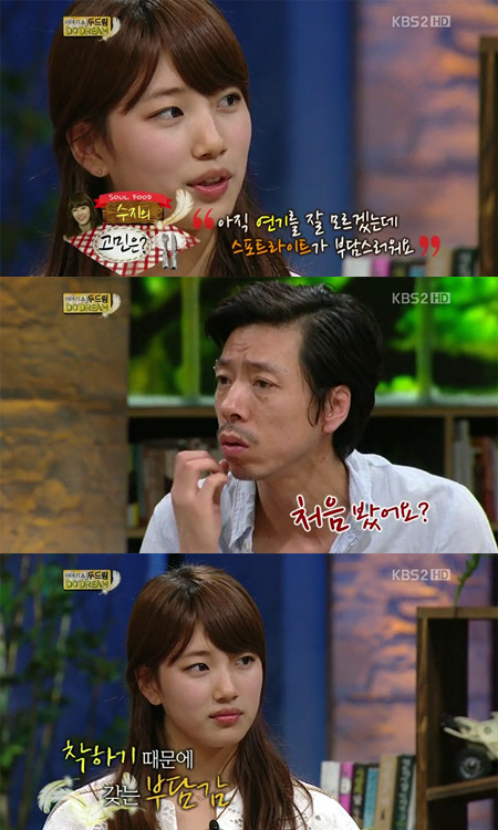 영화 '건축학개론'으로 백상예술대상에서 신인상을 수상한 수지는 이날 "아직 연기를 잘 모르겠는데 스포트라이트가 부담스럽다"며 고민을 밝혔다.