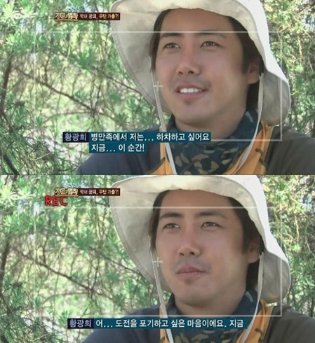황광희는 개별 인터뷰에서 "웃으면서 하고 싶은 말이 아니다. 병만족에서 하차하고 싶다. 지금 이 순간 도전을 포기하고 싶은 마음"이라고 고백했다. 이어 "마음의 준비는 하고 왔다. 몸은 견딜 수 있지만 정신적으로나 마음이 견디기 힘들게 다가온다. 도전에 대한 의사는 본인에게 있다고 하지 않았나. 다른 것 때문에 상처받고 싶지 않다"며 "포기를 쉽게 말할 수 있냐고 하는 사람도 있겠지만 그만큼 어렵다. 원래 멤버로 시작했기 때문에 함께 했다. 나는 매번 어렵고 가야할지 말아야할지 고민 많이 했다. 의기투합해야 하는데 쳐져 있으면 내가 힘이 안될 수도 있다. 이겨내는 것보다 오히려 안정을 찾는게 나을 것 같다"고 말했다.