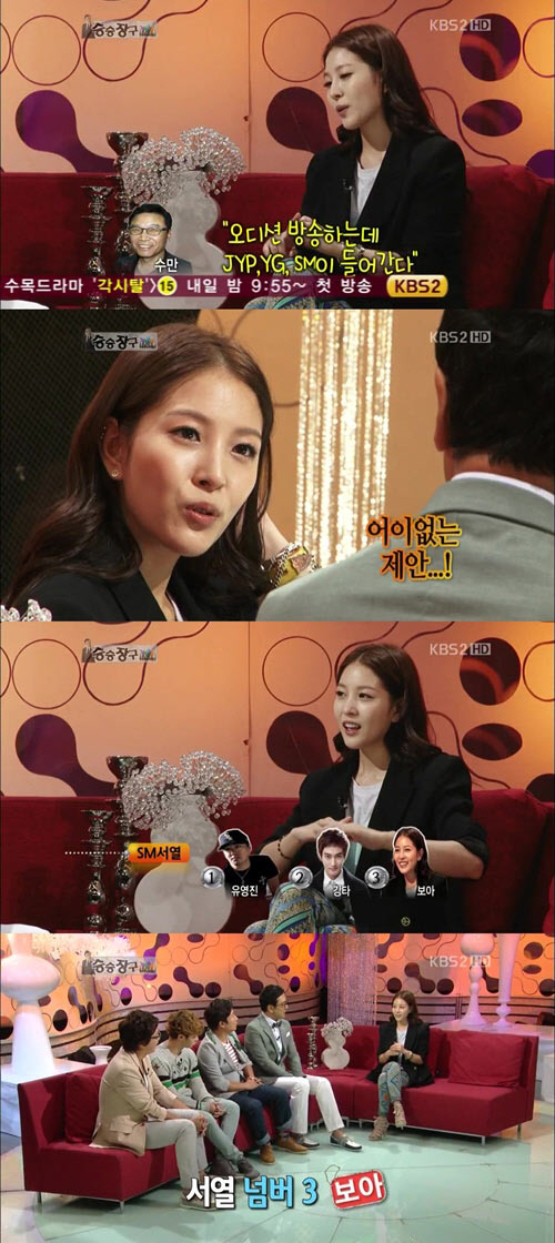 이에 탁재훈을 비롯한 MC들이 보아가 SM 서열 3위라는 사실에 놀라워하자 보아는 "그냥 오래된 순이다"며 쑥스러워하는 모습을 보였다.