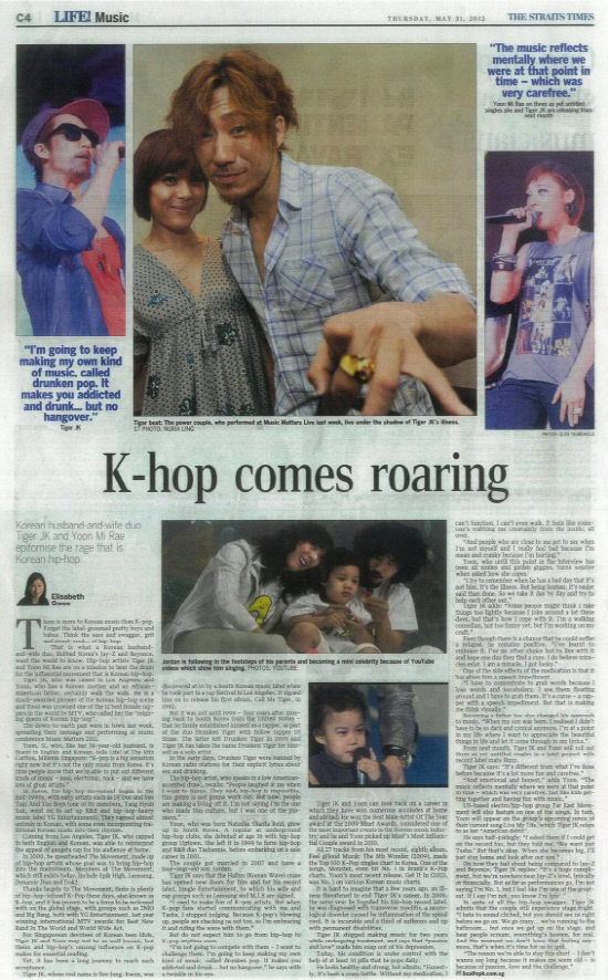 타이거 JK-t윤미래 부부가 싱가포르 최대 일간지인 '더 스트레이츠 타임즈(The Straits Times)'를 장식하며 진정한 월드클래스 뮤지션임을 다시 한번 입증했다.