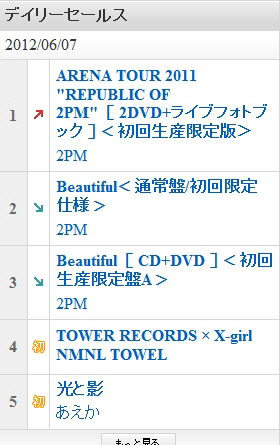 2PM은 지난 6일 새 앨범 '뷰티풀'과 2011년 아레나 투어 실황을 담은 DVD '리퍼블릭 오브 2PM'를 발매했다. 발매 직후 '뷰티풀'은 아라시 헤이!세이!점프 등을 제치고 타워레코드 6일자 시부야점 데일리 종합 차트 1위를 차지했으며, 7일자 데일리 차트 2위와 3위에 랭크됐다. 또 '리퍼블릭 오브 2PM'은 6일자 시부야점 데일리 종합 차트 4위에 오른데 이어 7일자 데일리 차트 1위까지 정복했다.