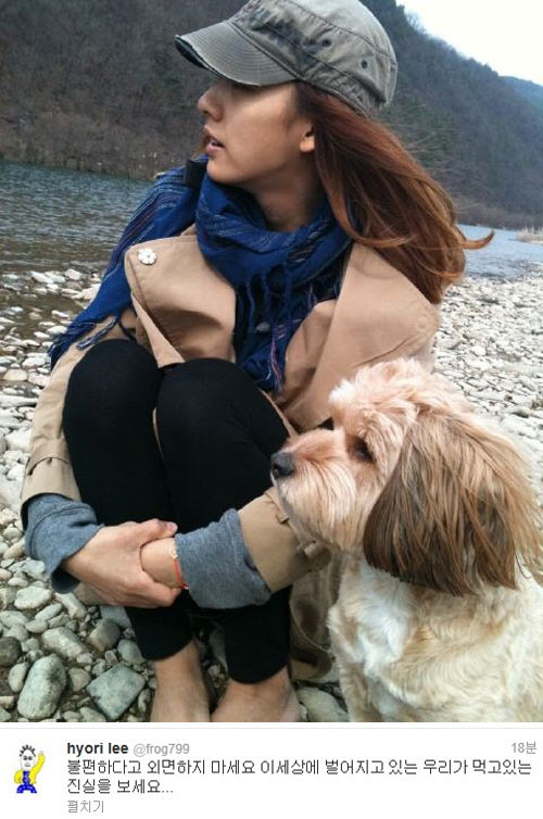 이효리는 10일 자신의 트위터를 통해 "불편하다고 외면하지 마세요. 이 세상에 벌어지고 있는 우리가 먹고 있는 진실을 보세요..."라는 글을 게재했다.