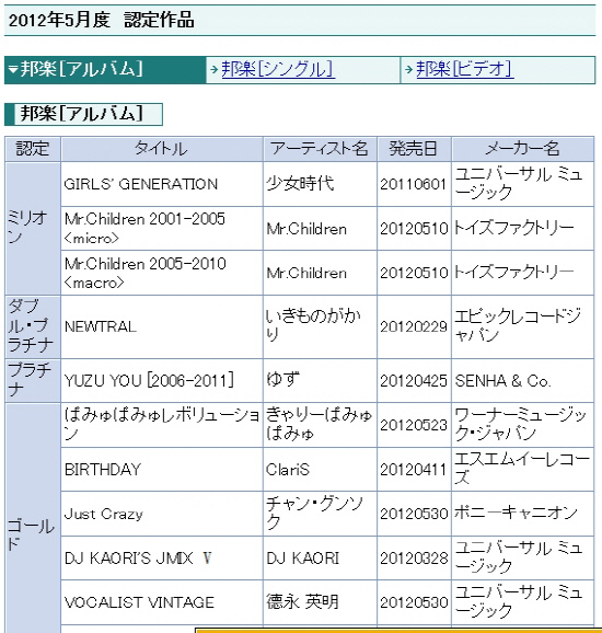 일본레코드협회는 최근 5월도 인증 작품 목록을 발표했다. 이에 따르면 소녀시대는 지난해 1일 발표한 첫 일본 정규 앨범 '걸즈 제너레이션'으로 100만 장 이상의 판매고를 올린 앨범에게만 부여되는 밀리언 인증을 받아냈다. 한국 가수가 일본레코드협회의 밀리언 인증을 받은 것은 보아(정규 1집, 정규 2집, 베스트 앨범) 이후 두 번째 일이자, 걸그룹으로서는 사상 최초의 성적이다. '걸즈 제너레이션' 발매 첫 주 역대 해외 아티스트 첫 정규 앨범 최고 판매량을 기록, 한국 걸그룹 사상 처음으로 오리콘 위클리 앨범 차트 1위를 차지했던 이들이 또 한 번 신기록을 세운 것.