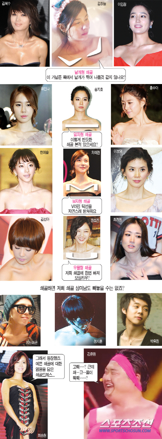 탤런트 김하늘이 드라마 '신사의 품격'의 목욕신에서 아찔한 쇄골을 드러내 쇄골미녀 바람을 일으켰다. 궁극적 미모의 완결 포인트로 여겨지는 쇄골은 꾸준한 운동과 자기관리의 산물로 여겨진다. 쇄골마저 예뻐야 진짜 미인이라는 속설을 증명하듯 한 미모 한다는 배우들의 쇄골은 무언가 특별하다. 몸매는 S라인, 얼굴은 V라인인 그녀들의 쇄골은 어떤 모양일까? 몸매와 미모는 기본에 예쁜 쇄골까지 겸비한 쇄골미녀들의 세계에 빠져 보자.