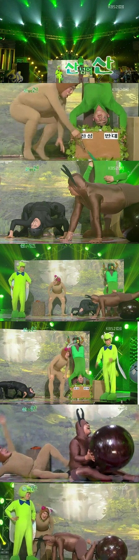여기에 지난 10일 방송한 '산 넘어 산'이 합류하면서 첫 방송부터 폭발적인 반응을 일으키고 있다. '산 넘어 산'은 개그맨들의 몸을 활용하는 전형적인 슬랩스틱 코미디다. 베짱이 이동윤은 아무 행동도 없지만 이상훈은 벼룩인 덕분에 코너 시작부터 끝까지 '펄쩍' 뛰어야 한다. 애벌레 김정훈은 계속 거꾸로 매달려 있어야 하며 거미 김혜선은 몸을 거꾸로해서 다녀야 한다. 쇠똥구리 유민상은 짐볼 위에서 몸을 엎드려 이동해야하는 불편함이 있다. 유준상이 등장하자 마자 "왜 이 코너를 한다고 했지? " "코너를 빨리 빨리 진행하자"고 외치는 것은 계획된 개그가 아닌 것처럼 보인다. '산 넘어 산'은 방송 후 각종 포털사이트 검색어 순위 상위권에 오르는 등 폭발적인 반응을 일으키고 있다. 슬랩스틱 코미디에 목말랐던 시청자들에게 '가뭄에 단비' 같은 코너로 등극한 것. 게다가 이날 '개콘'에서는 그동안 인기를 모았던 '비대위'와 '감사합니다' '교무회의'가 막을 내렸다.