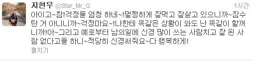 그리고 상황이 불편한 상황이 되었다고 해서 트위터를 통해서 자신의 불편한 심경을 토로한 것은 적어도 공인이 보여줄 모습은 아니었다는 것이 또 하나의 여론이다. 지현우가 트위터를 통해서 불편한 심경을 토로하기 전에는 그 사랑의 고백이 짝사랑 고백이었든 어떤 고백이었든 간에 응원을 해 주는 팬들이 많았다.