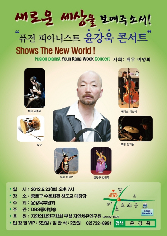 수차례 정기공연을 통해 마니아 관객층을 이끌어낸 피아니스트 윤강욱은 "음향과 음색은 음양에 따라 다르고 생각과 느낌은 몸과 마음의 움직임에 따르다"면서 "만약 다시 태어난다면 지구가 아닌 우주의 또다른 별에 태어나서 인간이 감지할 수 없는 천상의 소리를 만들고 싶다"고 음악에 대한 자신만의 열정과 자신감을 내비쳤다. 윤낭욱 후원회 주최와 자연의학연구학회 부설 자연치유연구원의 후원으로 펼쳐지는 이번 공연 티켓은 VIP석(5만원)과 일반석(2만원). 문의 (02)732-8991