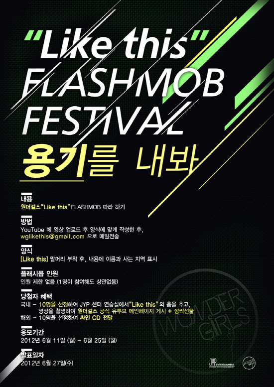 소속사 JYP엔터테인먼트 측은 "팬들에게 신선한 이벤트로 색다른 재미를 선사하기 위해 '라이크 디스' 플래시몹 페스티벌을 개최하게 됐다. 많이 참가해 주셔서 올 여름 원더걸스와 행복한 추억을 만드시길 바란다"고 전했다.