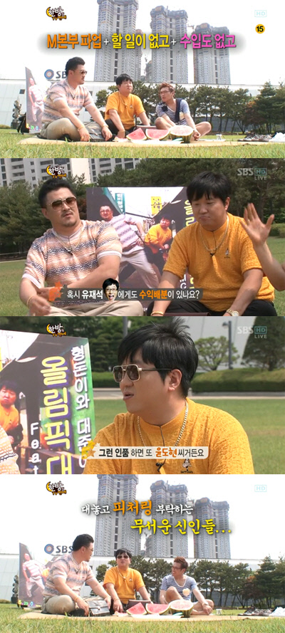 하지만 정형돈과 데프콘은 이 틈을 놓치지 않고 '한밤의 TV연예' MC를 맡고 있는 윤도현을 겨냥해 "그런 인품하면 윤도현이다. 부탁을 따로 드리는 건 아니지만 아무래도 윤도현의 인품과 성격이라면 한 걸음에 달려와서 2집 피처링을 해주지 않을까라는 생각이 든다"고 말해 폭소케 했다.