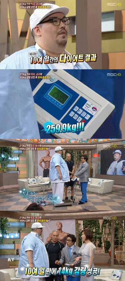 15일 방송된 MBC '기분좋은날'에 출연한 빅죠는 다이어트 12일에 경과한 현재 몸무게를 공개했다.