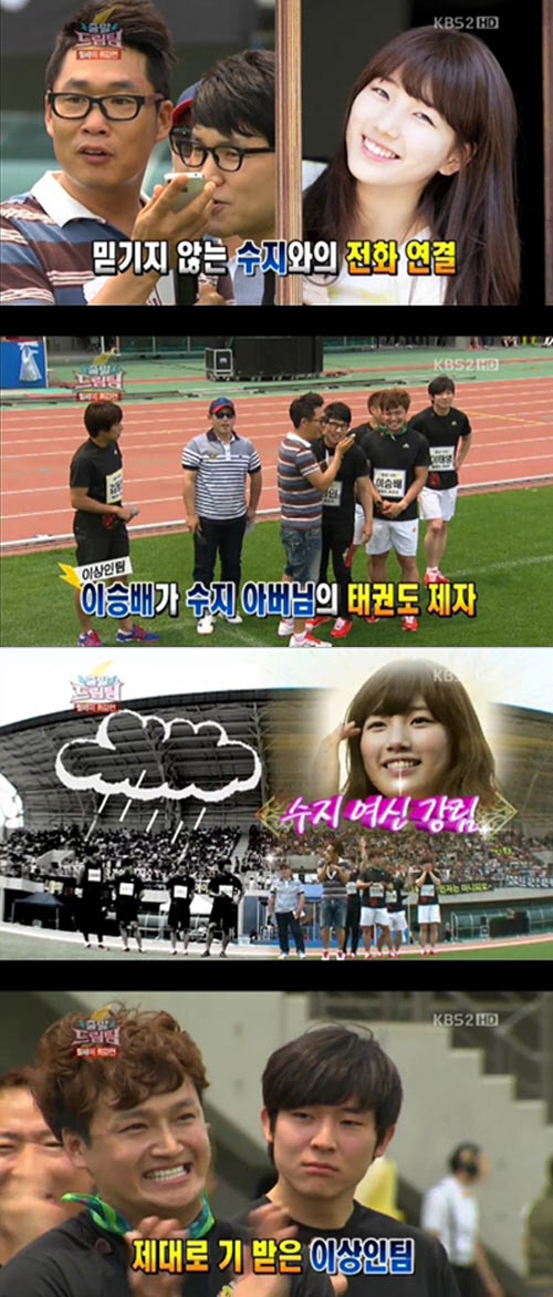 이어 연결된 수지와의 전화 통화에 MC 이창명 등 출연자들은 기쁨을 감추지 못했다. 수지는 "응원메시지를 던져달라"는 '출발드림팀'의 요청에 자신의 히트곡 'Bad girl good girl'(배드 걸 굿 걸)을 불러 남자 출연자들을 흐뭇하게 만들었다.